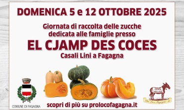 Due domeniche di ottobre speciali al "El Cjamp des Cocès"! La Pro Loco Fagagna è lieta di invitarvi a due giornate davvero uniche, con protagonista la regina dell'autunno: la zucca! Domenica 5 e Domenica 12 ottobre 2025 Dalle 10:00 fino al tramonto Presso El Cjamp des Cocès - Casali Lini Fagagna Un'occasione perfetta per le famiglie con bambini: potrete passeggiare tra i filari, ammirare tante varietà di zucche, e scegliere la vostra preferita direttamente dal campo! Vi aspettiamo per un’esperienza suggestiva tra natura, colori autunnali e divertimento all’aria aperta! Si consiglia di indossare calzature adeguate.